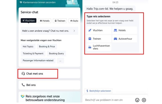 - Klik op "Chat met ons" om naar de detailpagina te gaan. Hier kunnen klanten chat-ondersteuning krijgen over verschillende onderwerpen, waaronder vluchten, hotels, treintickets en reisgidsen.