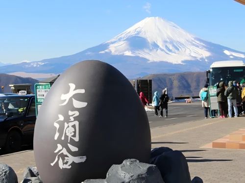 ▲ 13:10 ▼Owakudani - Ervaar de vulkanische sfeer die de schoonheid van Hakone vormt (ongeveer 50 minuten, vrije tijd mogelijk) Owakudani ligt in het zuidoosten van de Fuji, in het gebied van Hakone, en is een beroemde toeristische attractie van Hakone. De beroemde lekkernij van Owakudani - zwarte eieren Ongeveer 15 minuten lopen vanaf de ingang van het natuuronderzoekspad, bij een plek waar rook opstijgt, bevindt zich een winkeltje genaamd "Tamago Chaya". Hier worden ter plekke de beroemde zwarte eieren gekookt, waarvan wordt gezegd dat "het eten van één ei je leven met 7 jaar verlengt".