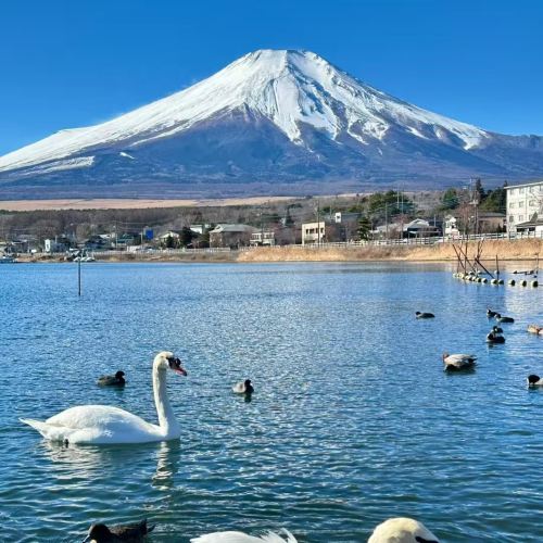 ▲ 15:00 ▼Witte Zwanenstrand bij het Yamanakameer - Maak een levensfoto met zwanen en de Fuji in één beeld (ca. 20 minuten) Aan het Yamanakameer, een van de vijf Fuji-meren, bevindt zich een plek die bekend staat als het "Witte Zwanenstrand" vanwege de grote hoeveelheden zwanen die hier verblijven. Het is niet alleen een geweldige plek om wilde vogels te observeren, maar ook een van de beste locaties om zwanen met de Fuji als achtergrond te fotograferen. De zwanen hier zijn erg mensvriendelijk omdat ze vaak door reizigers worden gevoerd.