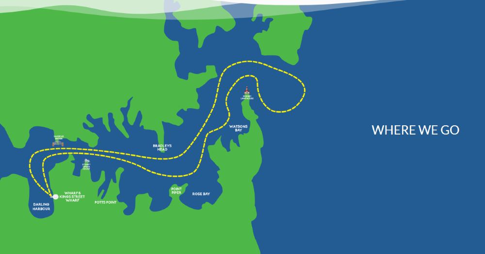 Vanaf Darling Harbour kunnen reizigers onderweg genieten van prachtige uitzichten op de Sydney Opera House, de Harbour Bridge, Taronga Zoo, Watsons Bay en de Hornby Lighthouse bij South Head.