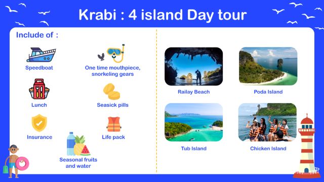 Je dag begint met een gemakkelijke ophaalservice vanaf je Hotel in Mueang Krabi District. Vanaf daar word je naar de pier gebracht waar je speedboot wacht, klaar om te beginnen aan een onvergetelijk eilandhopavontuur.