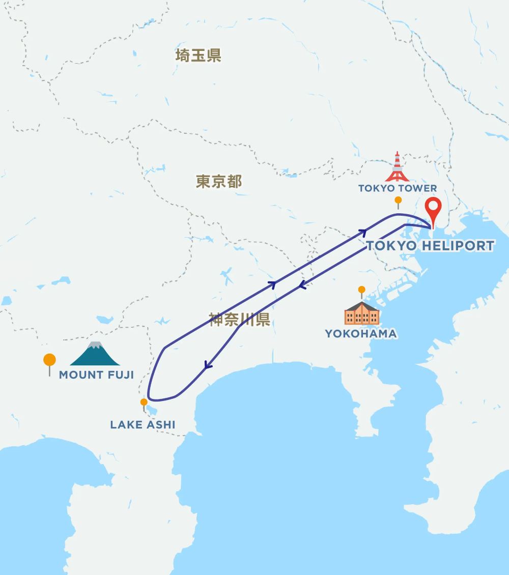 ※Er is geen landingsmogelijkheid in het gebied rond de berg Fuji. Zowel de heen- als de terugvlucht vertrekken vanaf Tokyo Heliport.